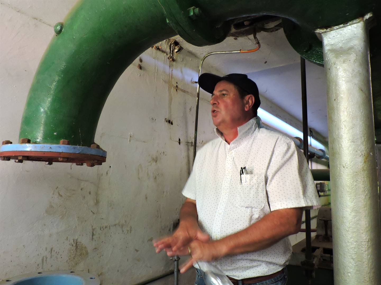 Rikus Rossouw, engineer of Bigen Africa, explaining the functioning of the old water plant. Parts that were moved from one piece of equipment to another, instead of replacing a defect part, contributed to the poor functionality of the plants. Photo: Helena Barnard
