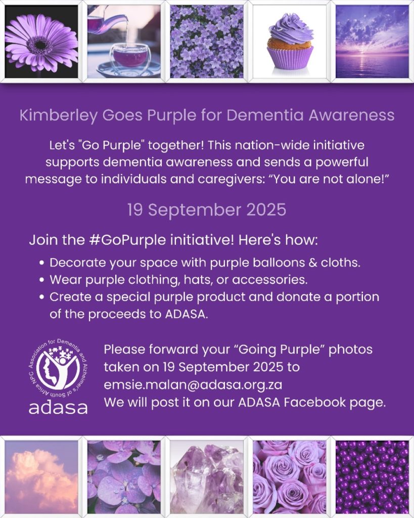 As deel van demensie-bewuswording word ‘n “Kimberley Goes Purple”-veldtog op Vrydag 19 September deur die Noord-Kaap-streek van die Vereniging vir Demensie en Alzheimer se siekte van Suid-Afrika (Adasa) aangebied.