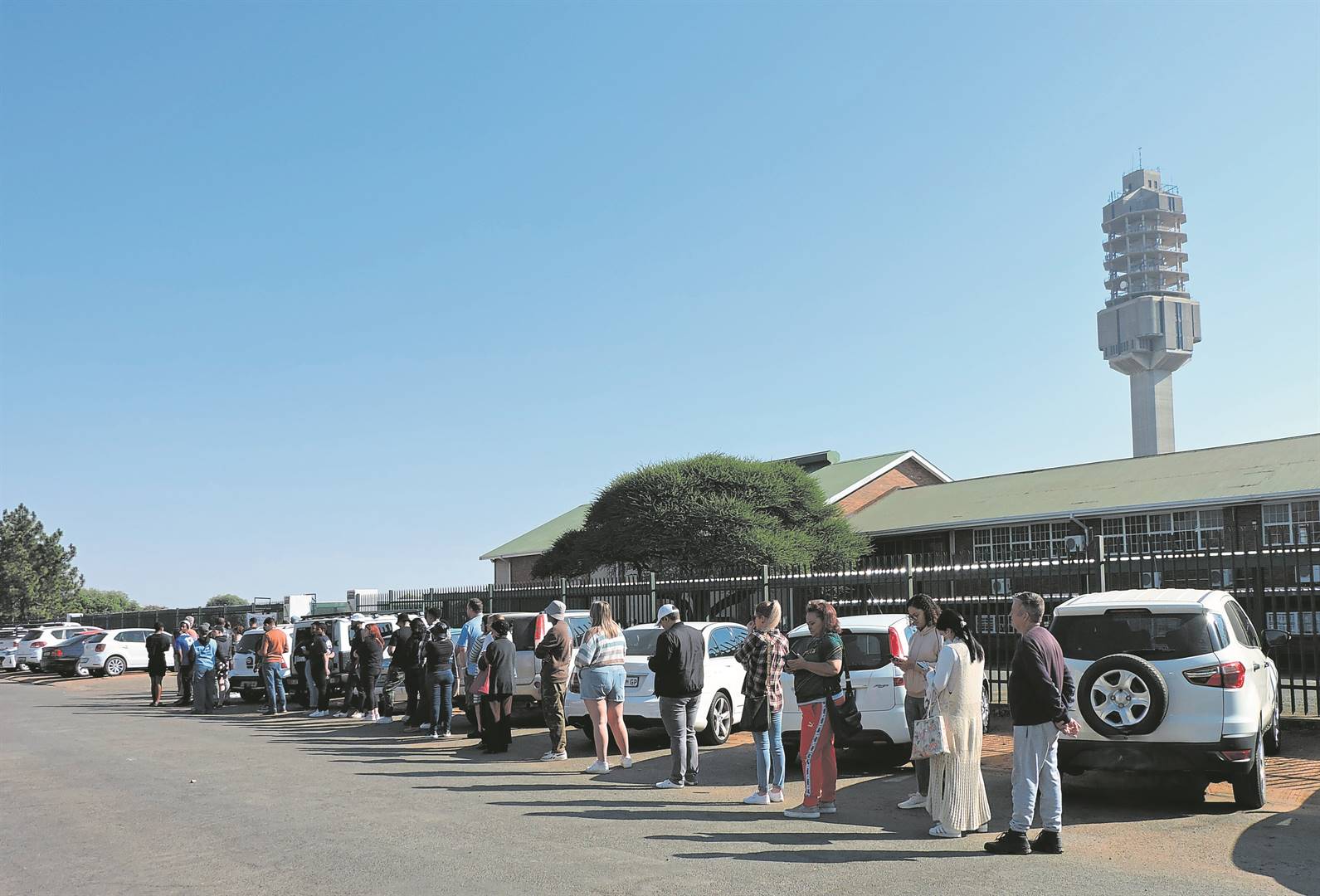 Kiesers staan en wag op stemdag om by die Kimberley Junior School hul kruisies te trek.