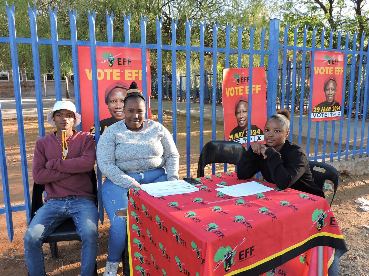 By die EFF se stalletjie voor die Laerskool Herlear is Khanya Morapeli Nkolonyane, Michael Aluwani Mungoni en Malebogo Joyce Rantsoeleba.