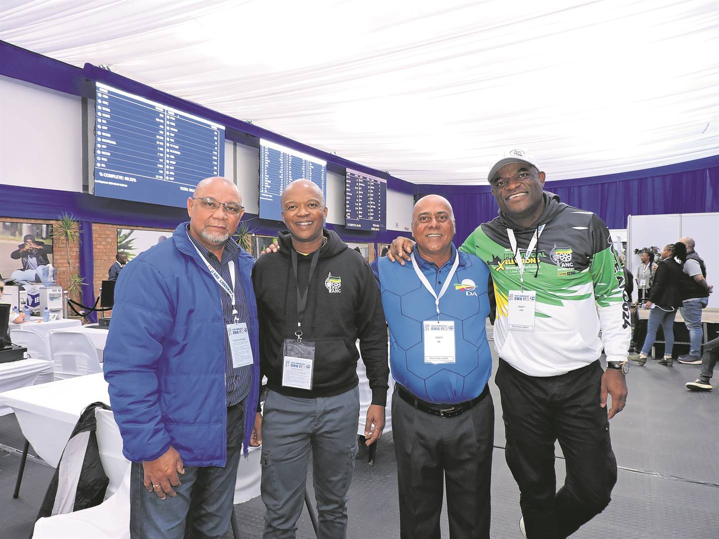 In die Verkiesingskommissie (OVK) se uitslagsentrum in Kimberley op Donderdag 30 Mei is van links Isak Fritz (DA-premierskandidaat), Maruping Lekwene (Noord-Kaapse LUR vir gesondheid), Harold McGluwa (DA-leier in die Noord-Kaap) en dr. Zamani Saul (premier van die Noord-Kaap).