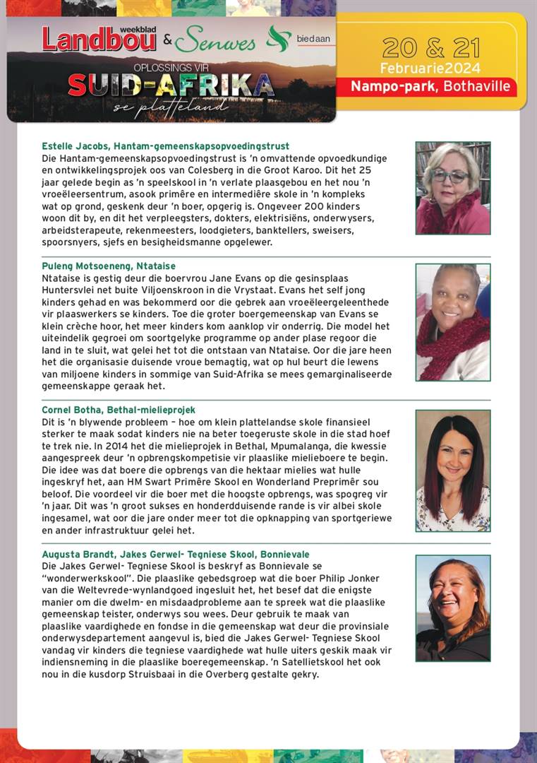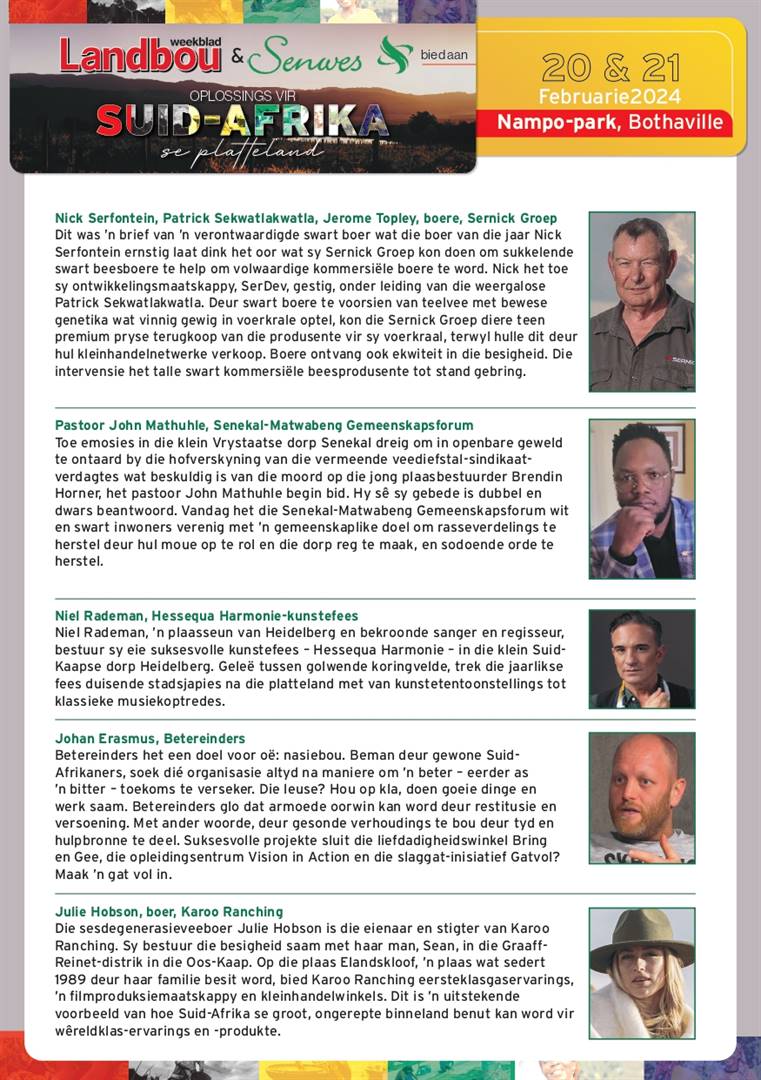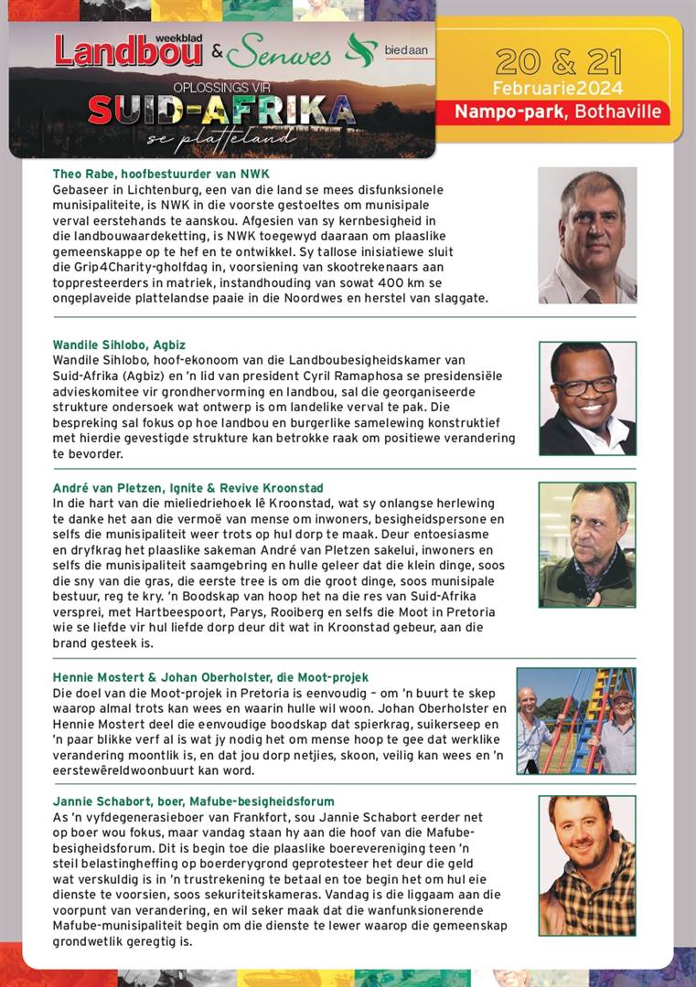 Gegrond op die formaat van Landbouweekblad se hoogs suksesvolle Bela-Bela-grondberaad in 2018, sal die suksesvolste gevallestudies van waar gewone Suid-Afrikaners besig is om beter gemeenskappe op te bou, ten toon gestel word.