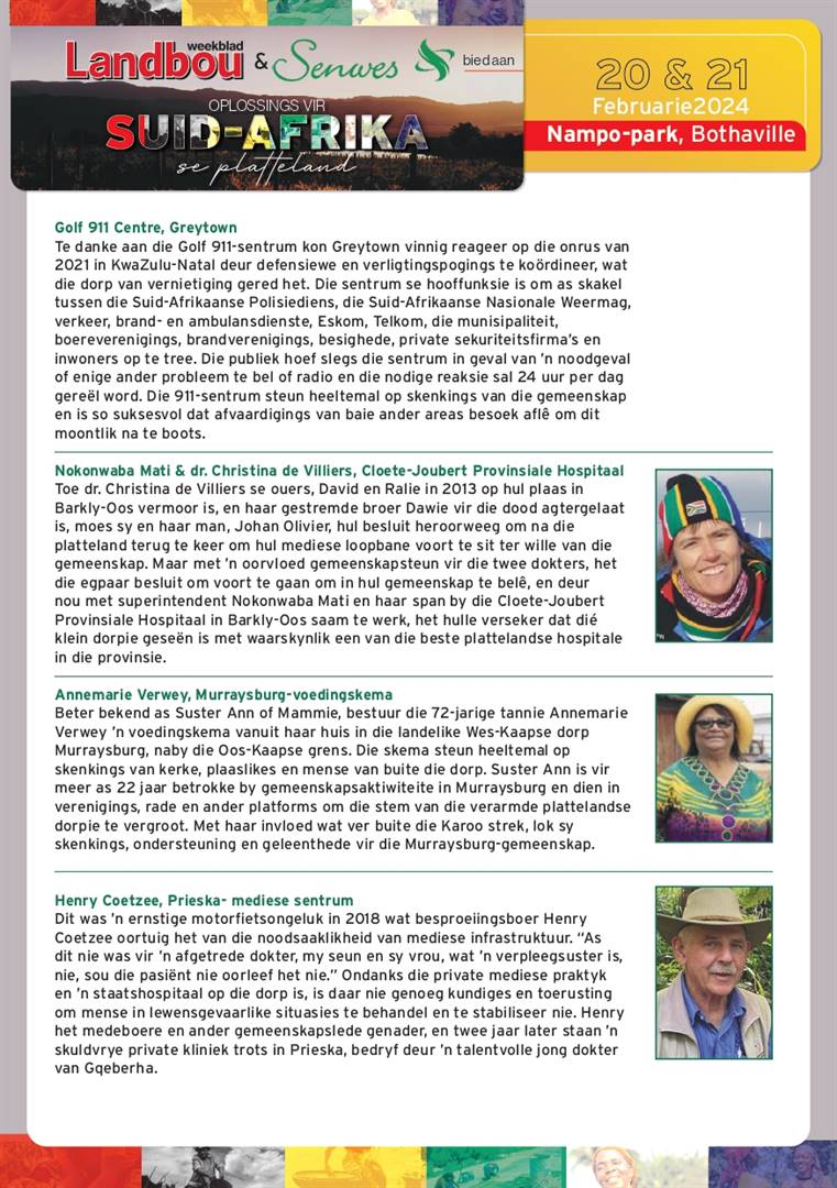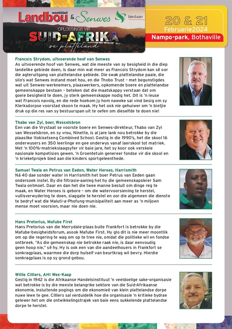 “Suid-Afrika se verval kan eenvoudig nie langer geduld of bekostig word nie. Dit is waarom ons op 20 en 21 Februarie 2024 die konferensie met die tema ‘Oplossings vir Suid-Afrika se platteland’ op Nampo-park, Bothaville, aanbied.”