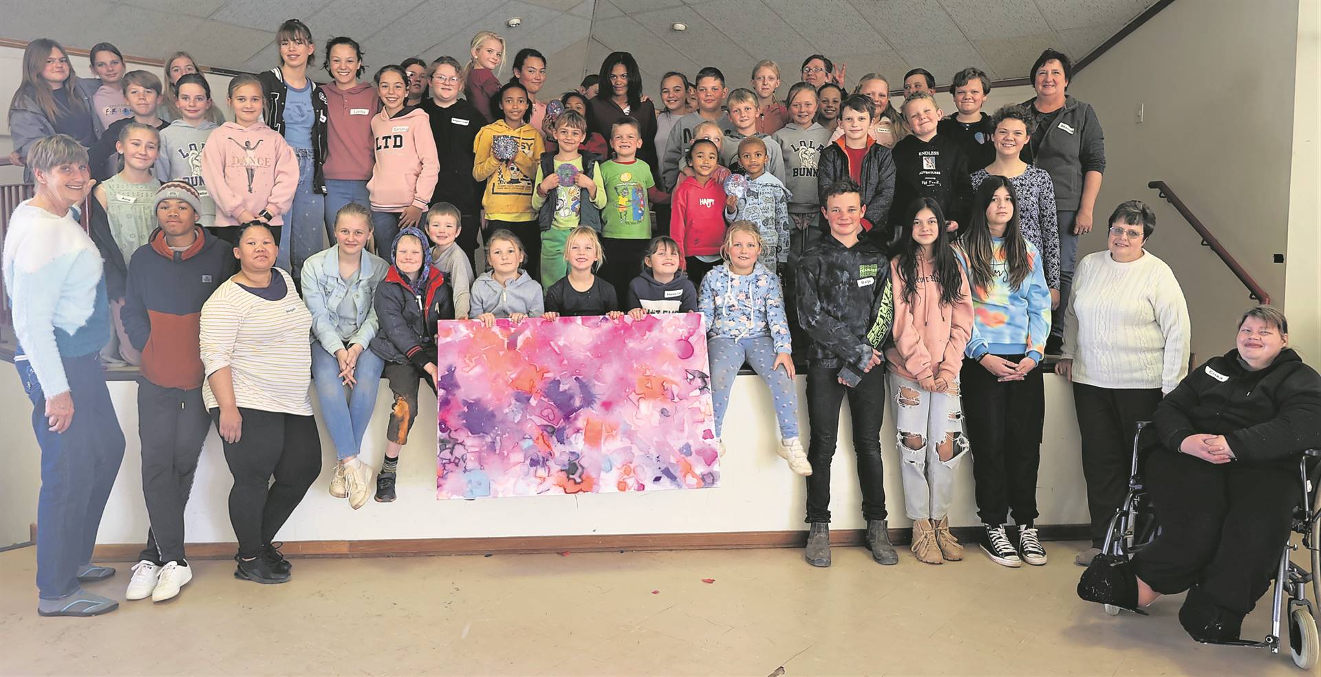 Sy en haar span het vroeër in Julie op ’n Saterdagoggend verskeie kunstegnieke aan 50 kinders by die NG kerk-gemeentesentrum geleer. Die kinders het ook onwetend as ’n span aan een groot abstrakte skildery gewerk wat aan die einde van die dag as ’n hoogtepunt uitgestal is.