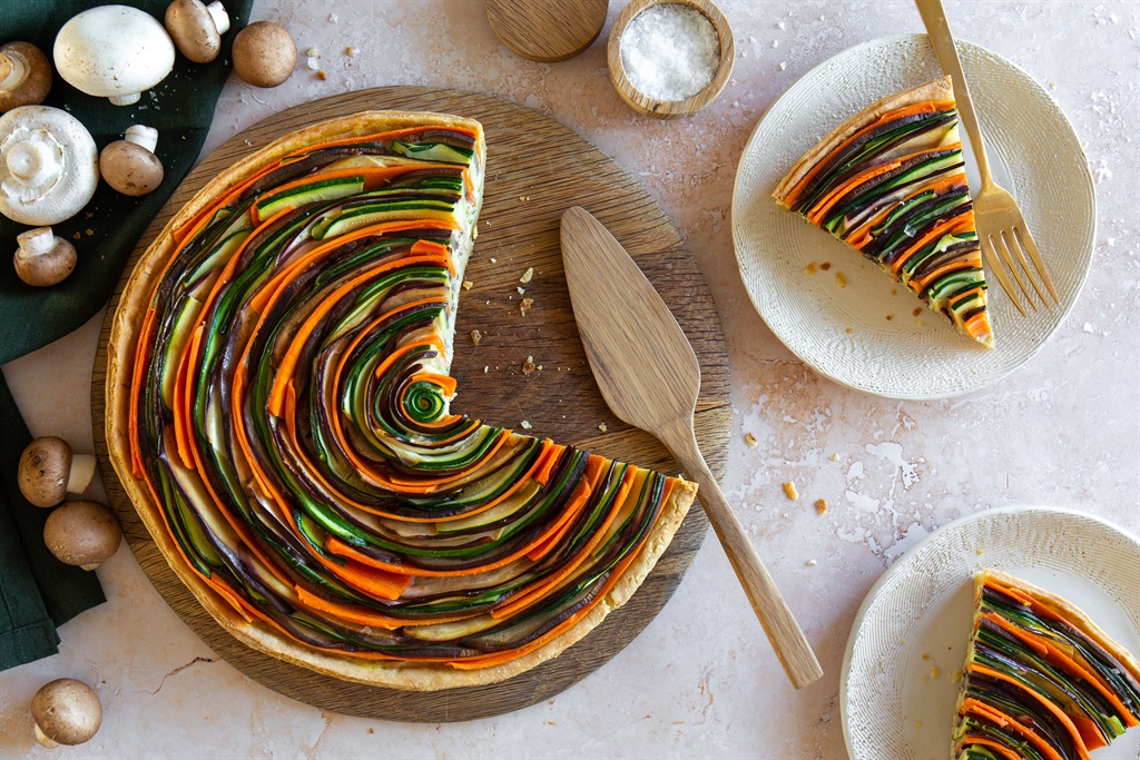 Smeer die vulsel eweredig oor die bodem van die kors. Begin aan die buitekant langs die rand van die tertpan en pak die groenterepies in lae, wissel af met elke tipe groente tot die hele pan vol is.