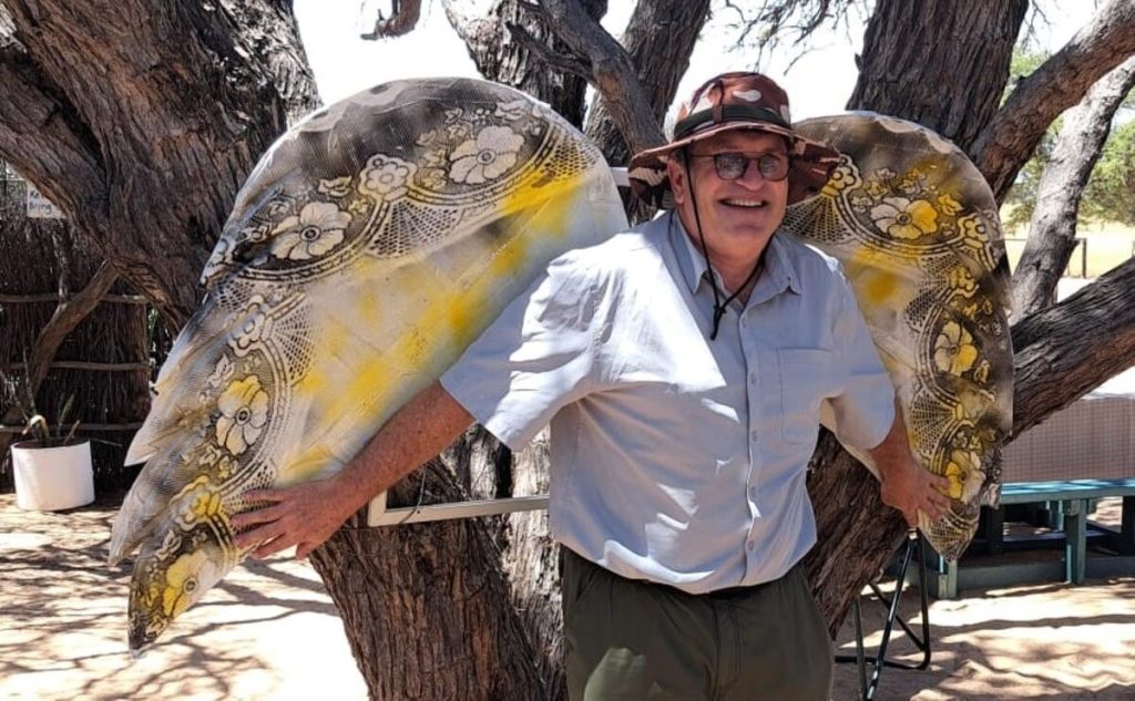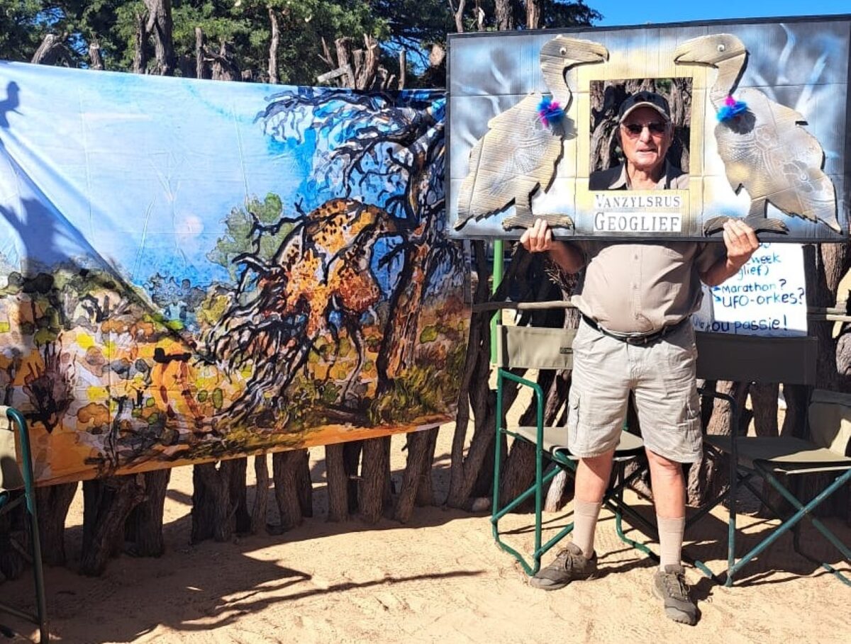 Willie de Bruin met een van die selfie-rame met die aasvoëlgeoglief as tema. FOTO: Verskaf