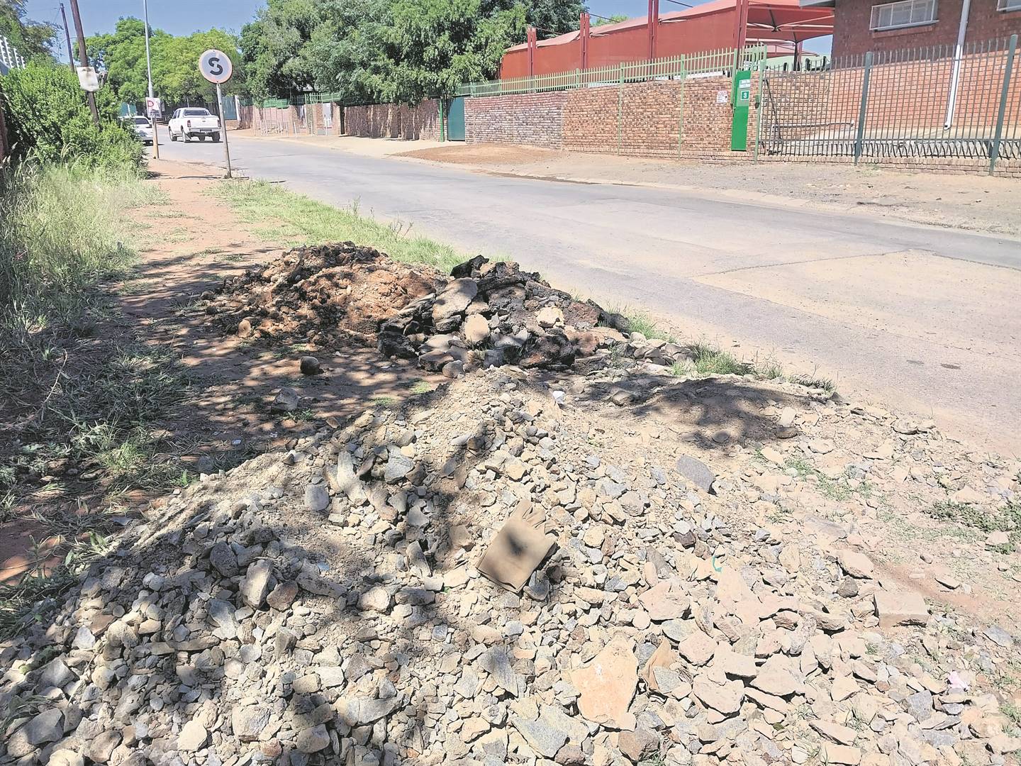 Die slaggate in Conradstraat, wat voor die Laerskool Newton verby strek, is uitgesny; al die teer hiervan is op die sypaadjie gegooi.