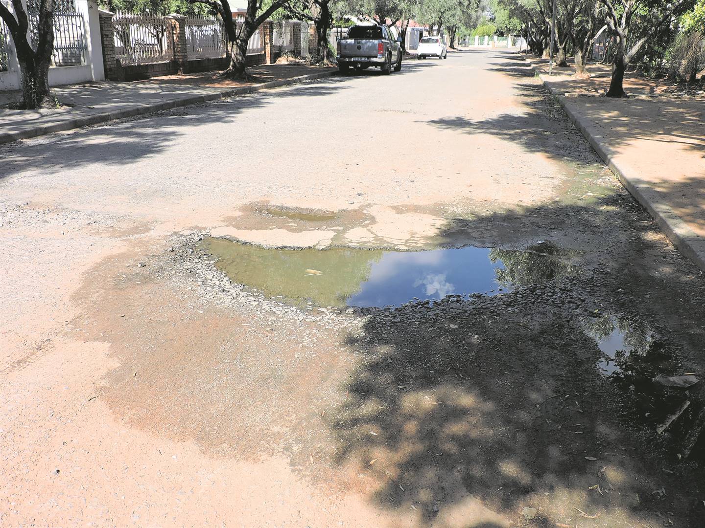 “Dan praat ek nie eens van die ander erg gevaarlike slaggat op die hoek van Ellen Carter- en Klisserweg op pad na die skool nie. Dit lyk asof die munisipaliteit daar ook ’n lekkende pyp reggemaak het, maar die rommel is net so daar laat staan. In Heerengrachtlaan in Royldene moet ’n mens vir die massiewe gat naby Gerrit Schoutenweg uitswaai en terselfdertyd probeer om aankomende verkeer te mis.
