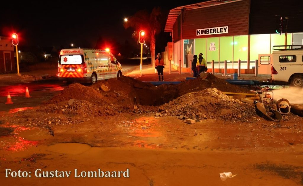 Volgens sers. Molefi Shemane, polisiewoordvoerder, was lede van die polisie omstreeks 23:49 by die ongelukstoneel in Schmidtsdriftweg. Shemane bevestig dat ‘n motor in ‘n gat ingery het waar werkers van die Sol Plaatje-munisipaliteit besig was om ‘n gebarste waterpyp te herstel. Shemane sê die motor is beskadig, maar geen beserings is aangemeld nie. ‘n Ongeluksverslag is oopgemaak, en word tans ondersoek.