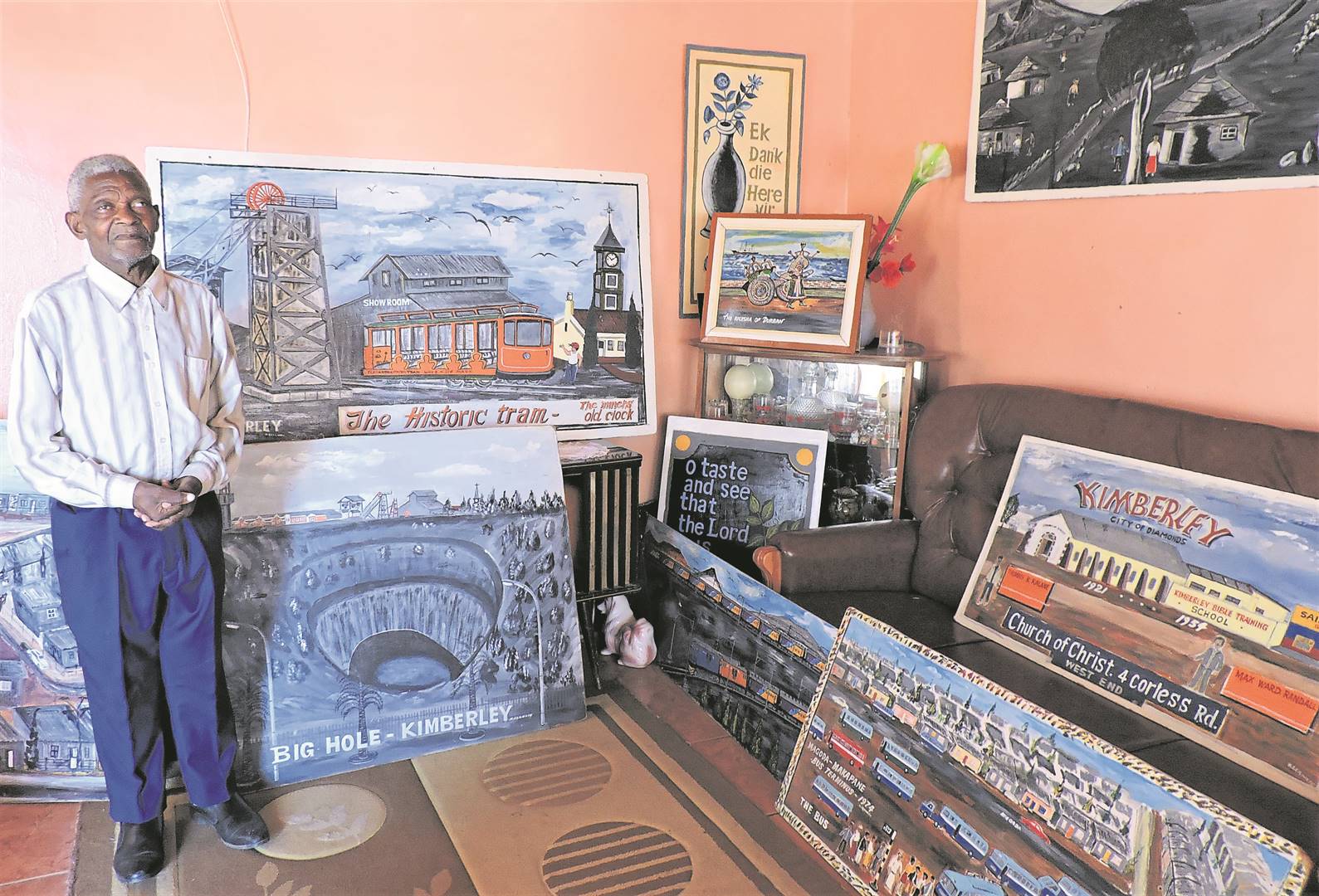 Kimberley se Groot Gat en treine – dit was nog altyd sy gunsteling-onderwerpe om te skilder. Ook die skilderye van sy waarnemings van openbare geboue, kerke, busse en plekke wat hy en sy vrou, Sylvia, al besoek het, vertel elk ’n eie storie én gee geskiedenis weer.