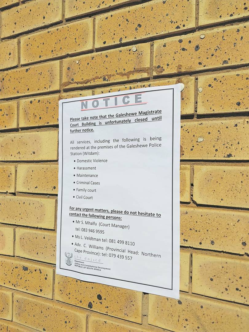 Hofsittings in Galeshewe in Kimberley wat gewoonlik in etlike hofsale geskied, het tot stilstand geknars nadat die departement van arbeid die gebou verlede week weens veiligheidsredes gesluit het.