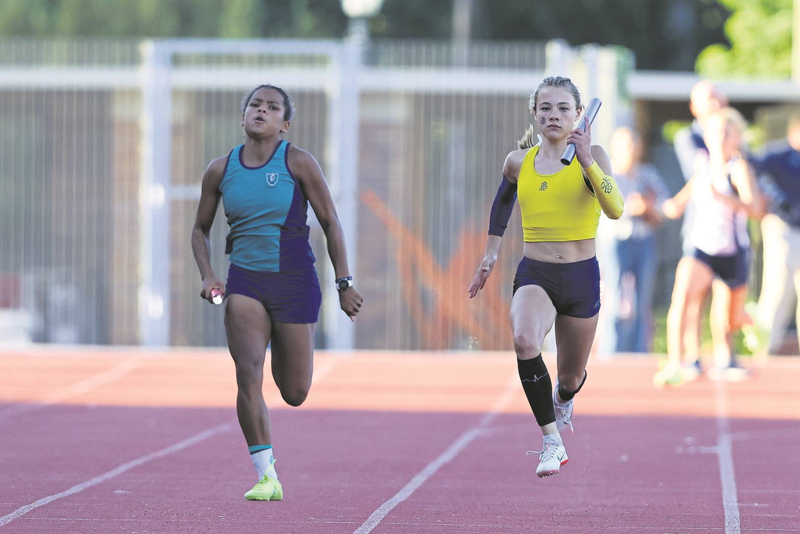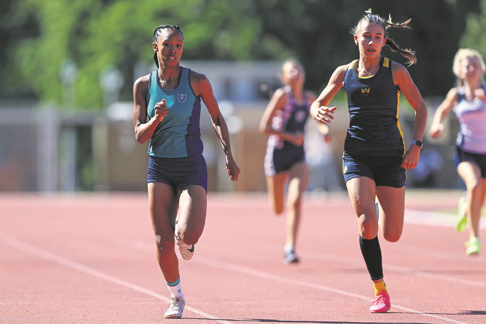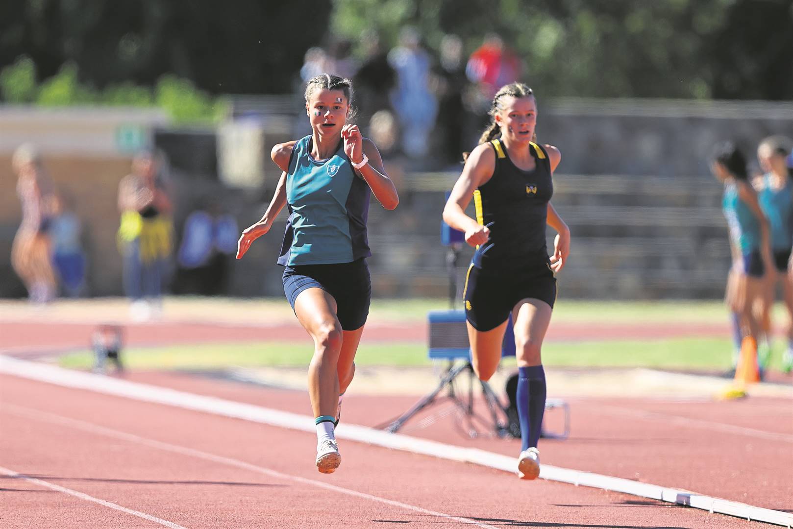 Chloe Stoffels van HMS hardloop kop aan kop met haar La Rochelle-teenstander in die o.14-400 m.Foto: