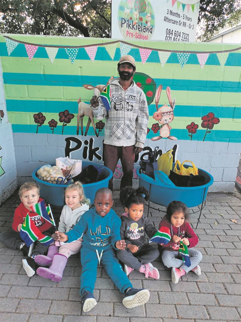 “Kossies is duur en werk is skaars! Ons tuinman, oom Frans Antonie, werk net een keer per week by ons, so ons het vir elke maatjie gevra om een item vir oom Frans op Mandela-dag te bring. Ons het ’n 67 minute drop-off drive vir Pikkieland se tuinman gedoen.” Frans het sy dankbaarheid vir Aiden, Mia-nique, Brilliant, Eli-Grace en Azraa van Pikkieland getoon.Foto: Charlene Malherbe
