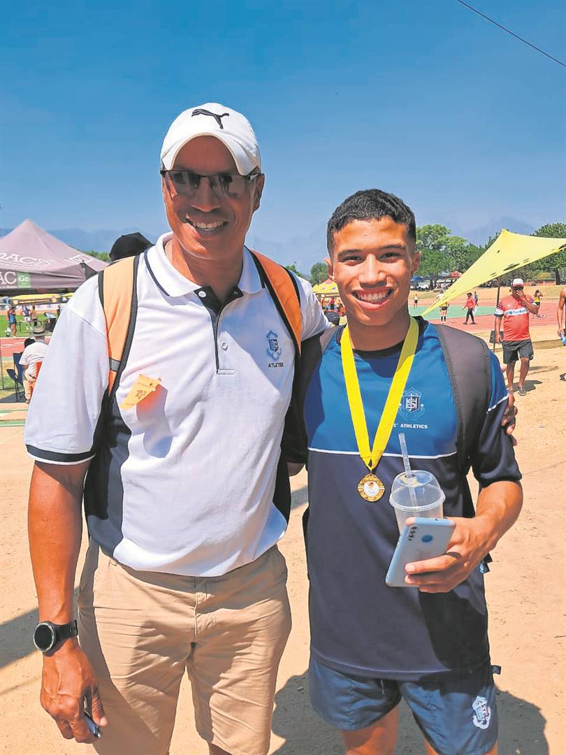 Ná die onlangse Boland-hoërskole-atletiekkampioenskap in die Dal Josafat-stadion is Micha Africa van die Hoër Jongenskool Paarl as die Boland-kampioen in die 100 m vir o.15’s aangewys. Bo is hy saam met sy afrigter, Shaun September.Foto: Ernest Kilowan