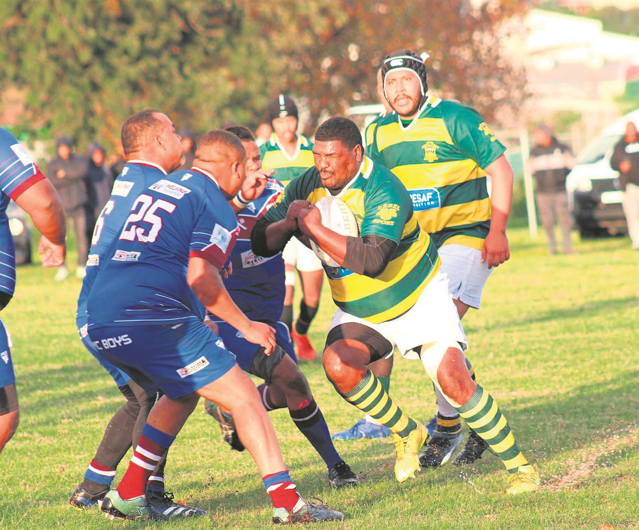 Die Albions-rugbyklub het die afgelope naweek teen Macassar gestruikel en hul WP- Superliga C-wedstryd op die Boy Louw-veld in die Paarl 43-12 verloor. Op die foto probeer Armenville “Army” Erasmus tevergeefs deur Macassar se verdediging bars. Foto: Ernest Kilowan