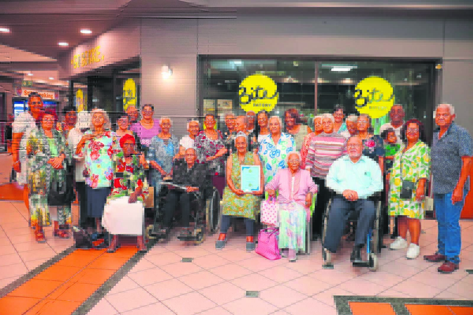 Wyksraadslid Joan Anderson van Wyk 26 het vir bejaardes bo 80 jaar binne die wyk ’n Kersete met musiek en geskenke gereël. Op die foto verskyn van die bejaardes.Foto: Verskaf