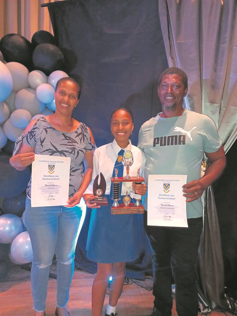 Caroché Simons, ’n gr. 7-leerder aan die Laerskool Paulus Joubert, is onlangs as die skool se beste kulturele presteerder aangewys. Sy het ook ’n sertifikaat gekry vir die diens wat sy die afgelope jaar as prefek gelewer het. Saam met Caroché is haar trotse ouers, haar ma, Roseline, en haar pa, Edvin.