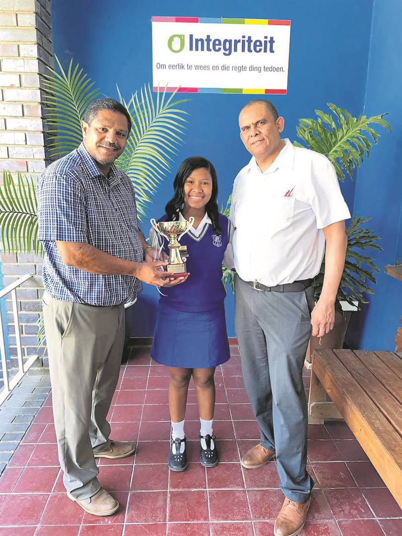 Béyonce Smit (middel) van Paulus Joubert Sekondêr is onlangs as die wenner van die Adri Brown-wisseltrofee aangewys. Hiermee word erkenning gegee aan haar prestasie in Afrikaans huistaal. Saam met Béyonce staan Terence Adonis (links), waarnemende skoolhoof, en Deon Slamet, Afrikaans-vakhoof. Die skool is baie trots op Béyonce.