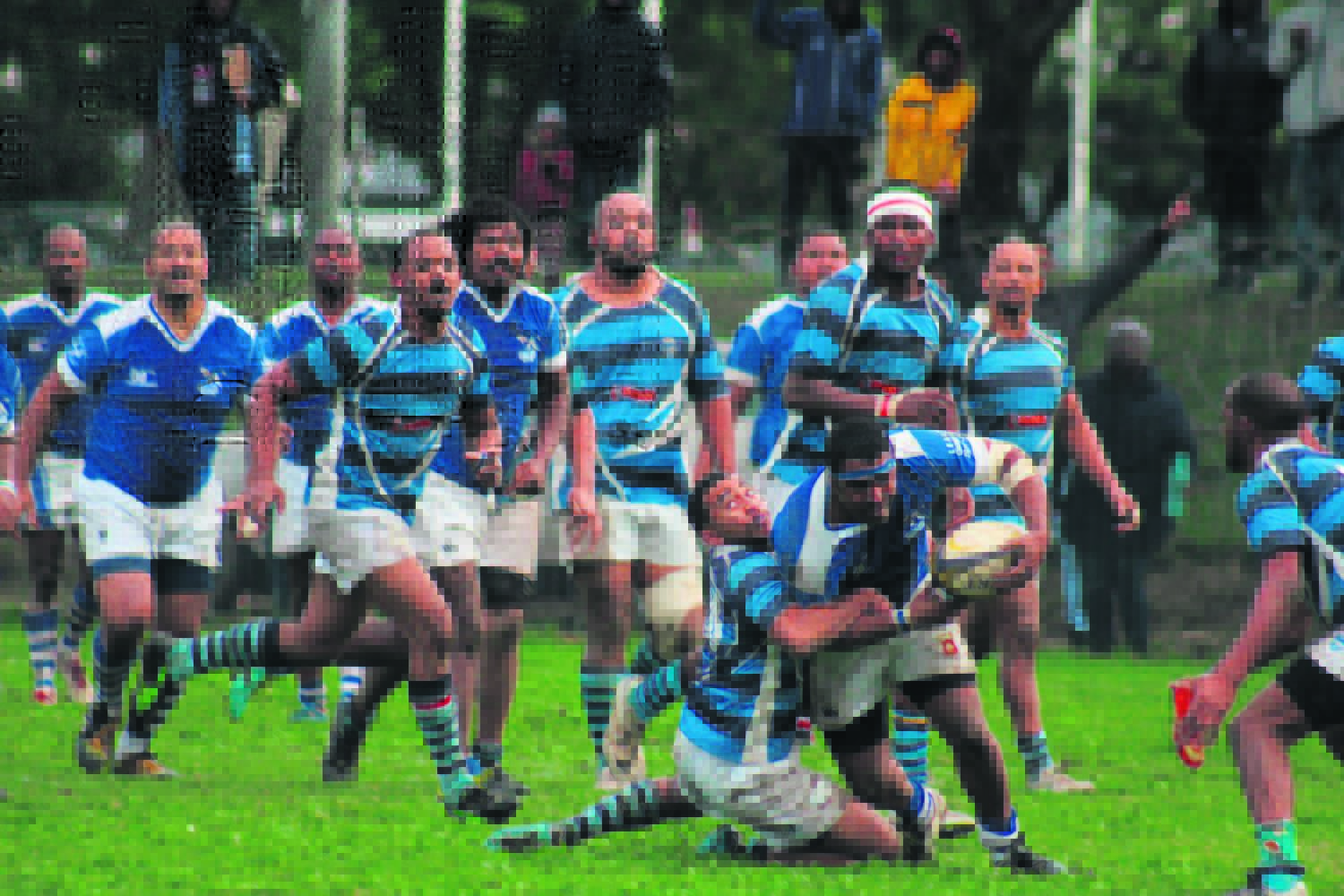 Die Laer-Paarl-rugbyspan (Blues) en die Riverstones het mekaar die naweek in ’n spannende wedstryd by die Chicago Derby aangedurf. Op die foto is Warren Petersen van die Blues-rugbyspan haastig op pad na die doellyn vir die span se wendrie. Die Blues-rugbyspan het die wedstryd 19-18 in ’n sopnat Dal Josaphat-tadion gewen.