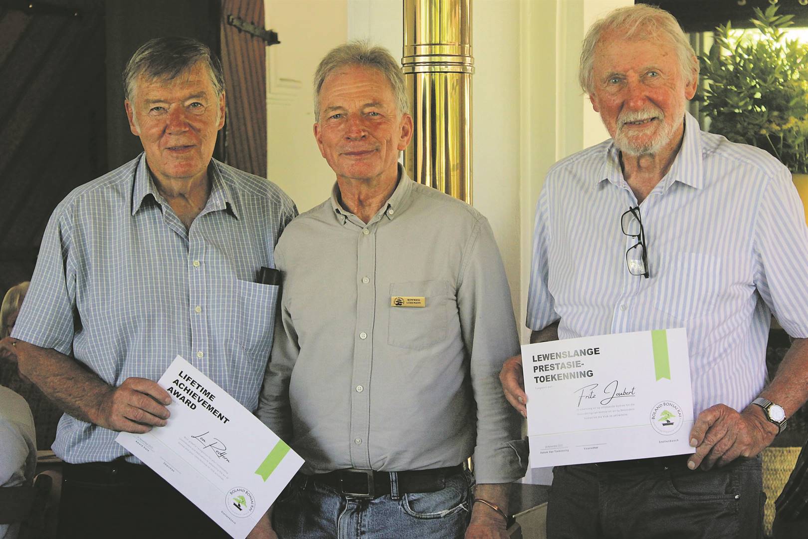 Len Redfern (links) en die oud-Paarliet Fritz Joubert (regs) is Saterdag vir hul lewenslange prestasie in die bonsaiwêreld vereer. By hulle is die voorsitter van Boland Bonsai Kai, prof. Winfried Lüdemann, wat die toekennings by die 30ste verjaardag van die klub oorhandig het. Die geleentheid het gepaard gegaan met ’n uitstalling van meer as 80 bonsai’s in die Rupert-museum onder die beroemde Pierneef-stasiepanele.