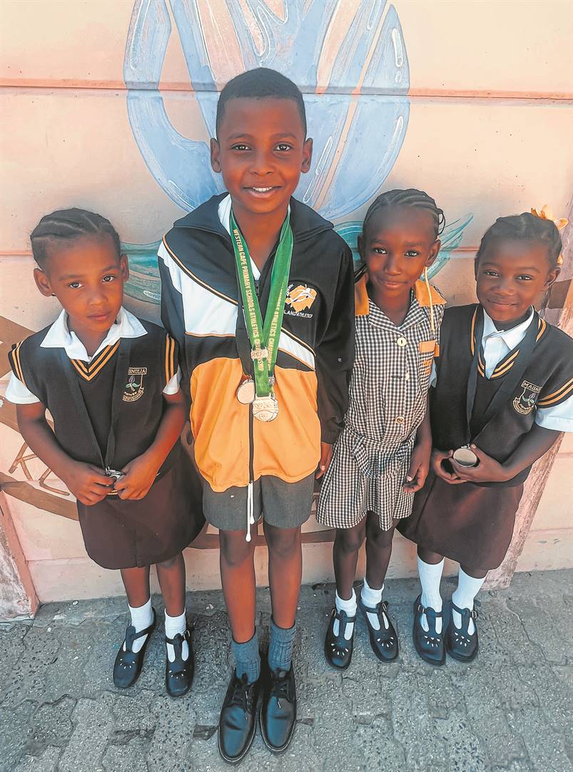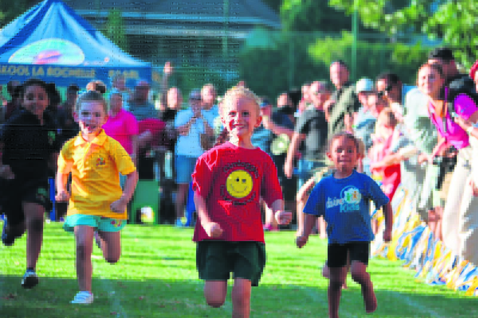 Isabel Brand (in geel) van die Miracles-kleuterskool en haar niggie, Lika Brand (in rooi), van Gimlaggies, hardloop kortkop agtermekaar in hul resies by die jaarlikse preprimêr Buksiedag wat by die Laerskool La Rochelle in die Paarl gehou is. Heel regs is Arney Smit van Divine Kids.