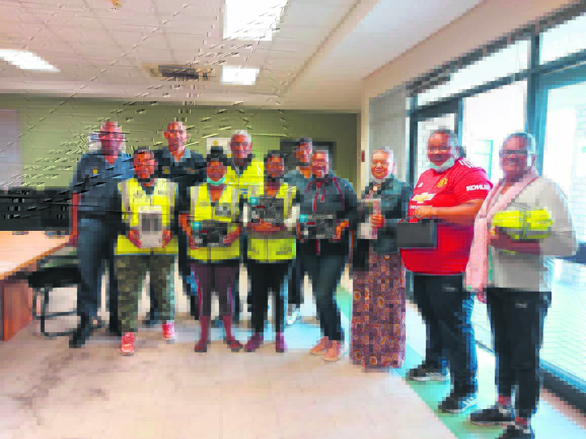 Paarl-Oos-polisie het onlangs veiligheidstoerusting oorhandig aan lede van die Chicago-buurtwag. Die toerusting sluit in tweerigtingradio’s en glimbaadjies. Agter is kol. Mzimkulu Jack (vispol-hoof), sers. Grandhal Esau (GPF-koördineerder), Raymond Fransman (GPF-voorsitter) en Berry Engelbrecht. Voor is Helen Roland, Spaas Swat, Leentjie Fry, Shireene Joseph (sub-forum-voorsitter), Shireen Anter (GPF-sekretaris), sers. Vanessa Adams (Chicago-koördineerder) en Helen Engelbrecht.