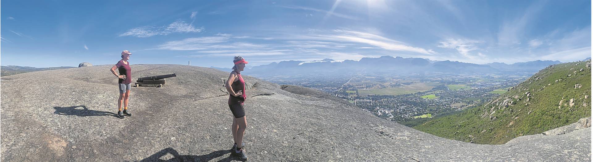 Twee dapper stappers staan bo-op Paarlrots op Paarlberg by die geskiedkundige kanon, van waar asemrowende uitsigte oor die Paarl-vallei geniet kan word. Die Paarlberg bied talle stap- en fietsryroetes op die pragtige berg vir mense van alle fiksheidvlakke. Besoek www.paarladventuretrails vir besonderhede oor veilige roetes.Foto: Martin Hamer