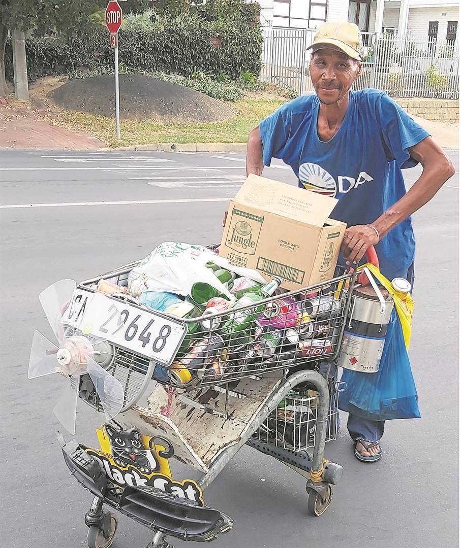 Selfs op ’n Sondagmiddag doen Dirk Viljoen sy deel om Wellington se strate skoon te hou. As inkomste versamel hy onder meer papier, glasbottels en koeldrankblikkies. Hy het self die trollie waarmee hy die artikels vervoer, die afgelope maande aangepas. Foto: Engela Duvenage
