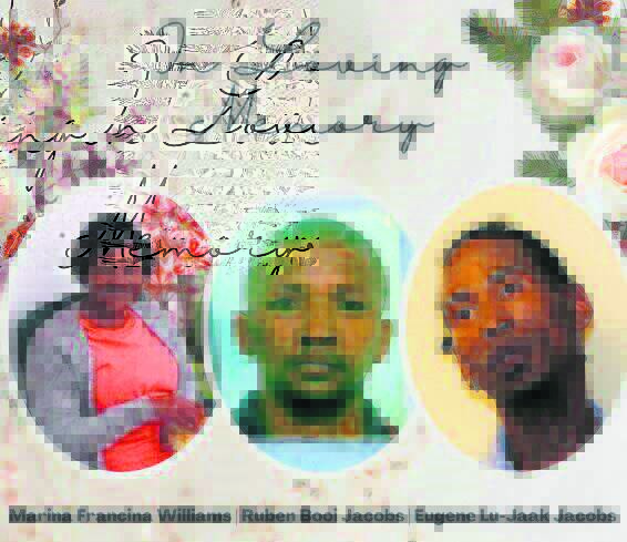 ’n Gedenkdiens is Sondag (22 Oktober) gehou vir Marina Williams (62), haar man, Ruben Jacobs (59), en hul seun, Eugene Jacobs (41), nadat hulle vermoedelik in een van die hutte vasgekeer was en verkool het.