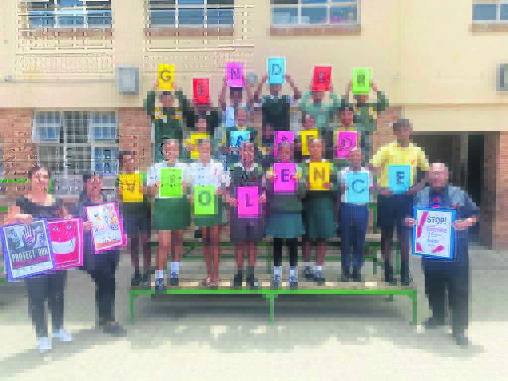 Wellington Primary School and Child Welfare SA recently held an awareness campaign at the school to raise awareness about gender-based violence in the community. Here with some of the Grade 6 and 7 learners are from left Gaynore Pietersen (Child Welfare SA), Shannon-Lee Siebrits (school care and support assistant) and Julius Williams (principal).