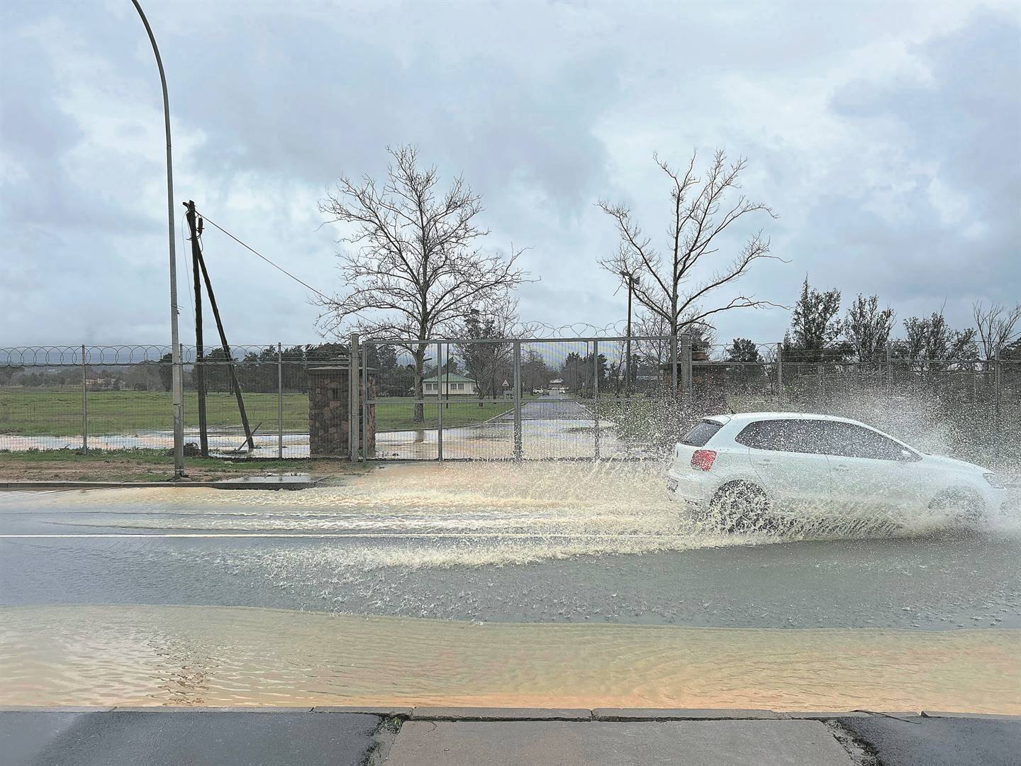 ’n Voertuig ry Woensdag deur water wat by die Allandale-gevangenis in Paarl-Oos se hek uitstroom. Foto: Rasaad Adams