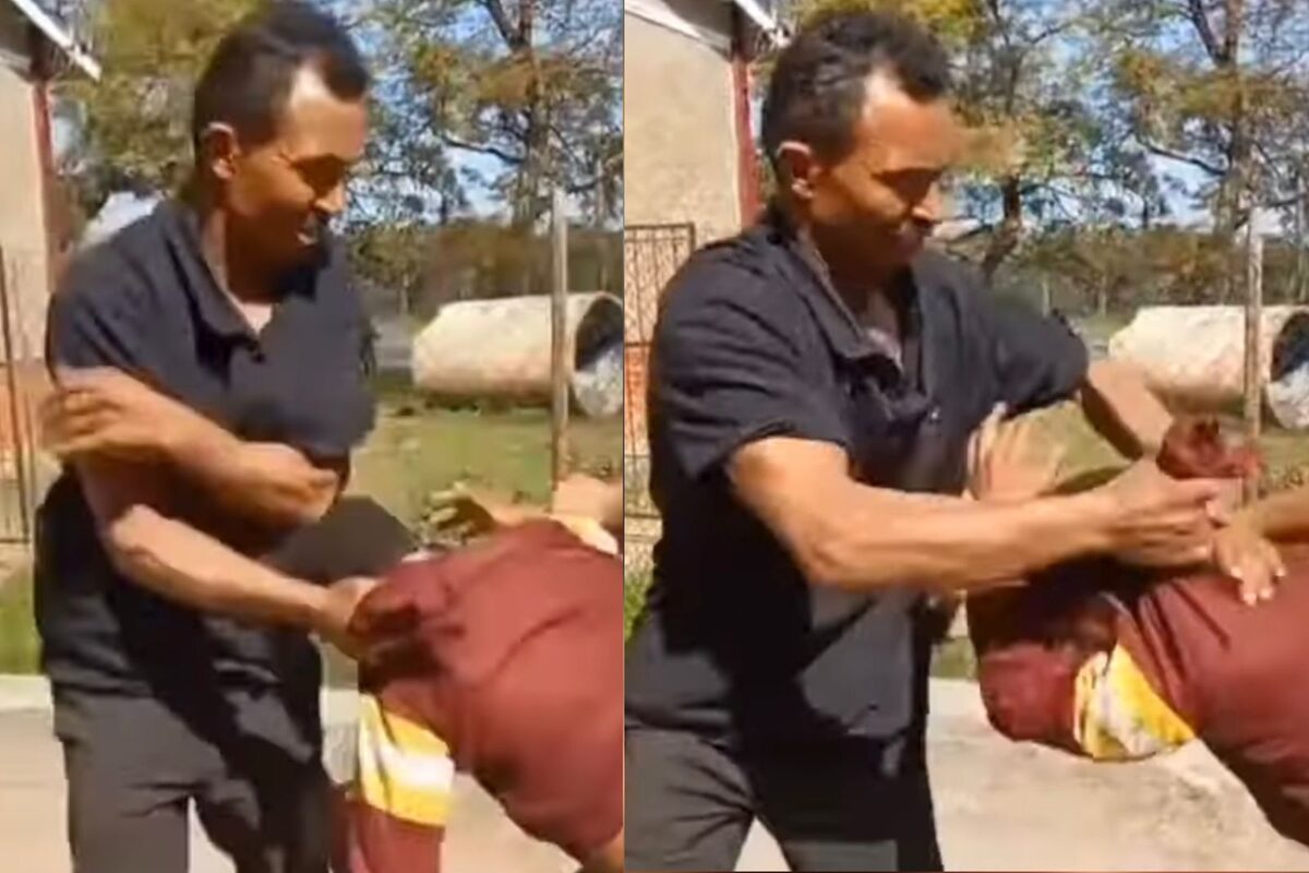 Op dieselfde oomblik skree ‘n onderwyser “dis ‘n kind, meneer”, terwyl ‘n ander onderwyser besig is om die hele voorval te verfilm en verder skree “meneer, dis die tweede keer. Meneer het dit mos klaar gedoen. Meneer het mos die vorige keer vir hom so seer kom maak op die skool. Ons het dit op kamera”.