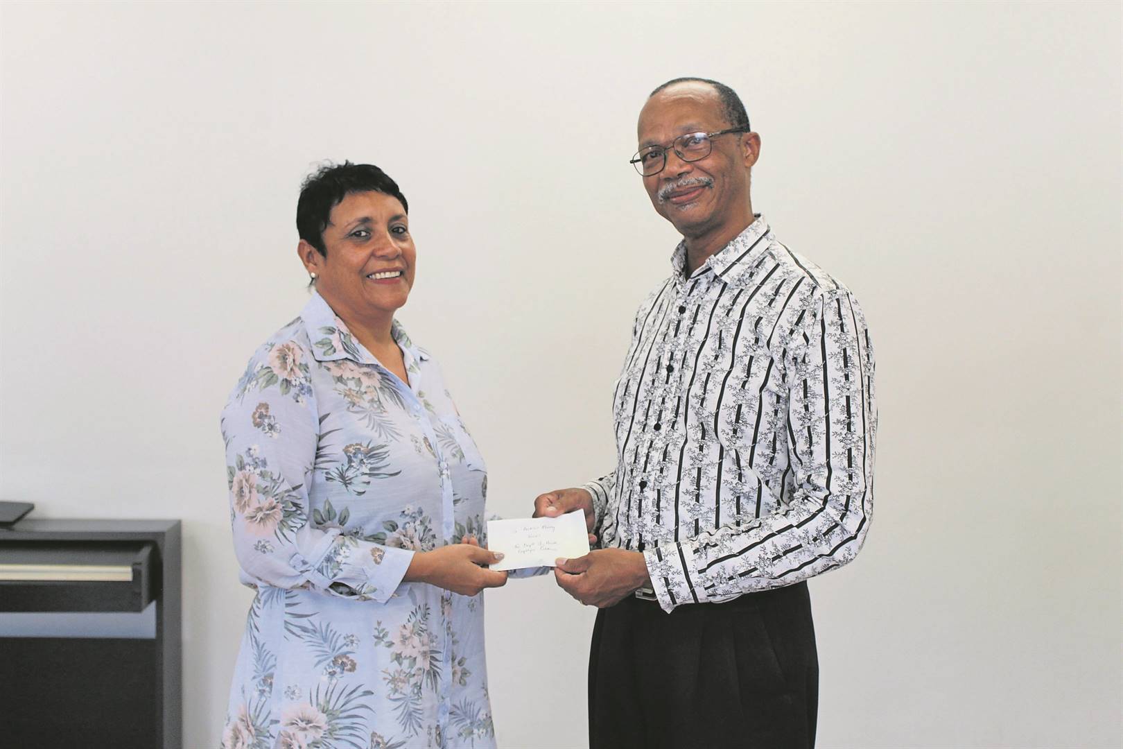 Lede van die departement van gesondheid en Drakenstein-munisipaliteit het op 15 Desember by Huis Andrew Murray besoek afgelê om ’n finansiële skenking aan die kinderhuis te oorhandig. Karen Petersen van HAM ontvang die skenking van Joey Roman.Foto: Heleen Rossouw