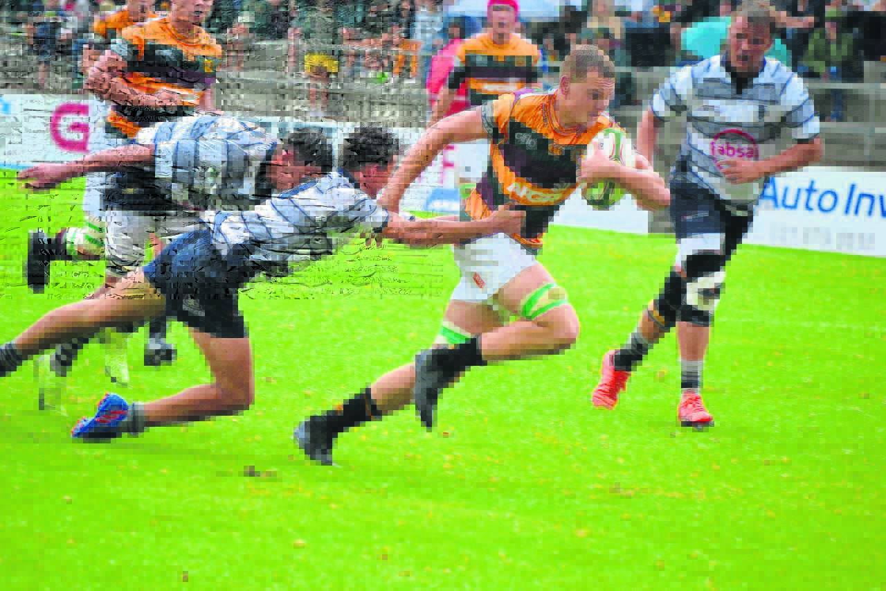 Die Hoërskool Paarl Gimnasium het omtrent ’n rekordtelling aangeteken toe sy eerste rugbyspan die naweek teen Potchefstroom Gimnasium gespeel en 83-3 gewen het. Hier is Gim se flank, Louw du Toit, onstuitbaar.Foto: