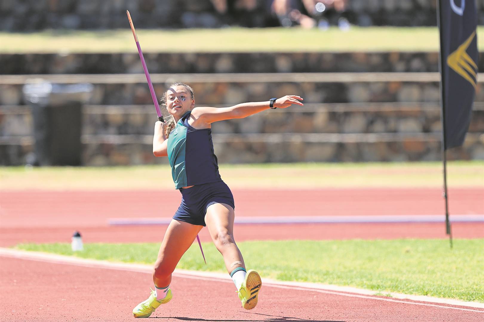 Mikayla Steenkamp van HMS maak gereed om haar spies ver te gooi in die o.15-spiesgooi.Foto: