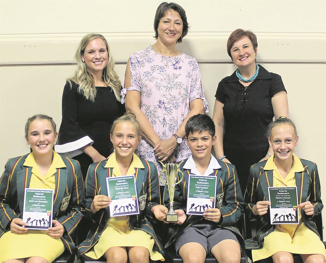 Laerskool Paarl Gimnasium se interne redenaarskompetisie is Maandag 2 Maart aangebied. Die gr.6- en gr.7-leerders moes elkeen ’n onvoorbereide, sowel as ’n voorbereide, toespraak lewer. Die leerders het hulle uitstekend van hul taak gekwyt en die gehoor van hul standpunte en redenasies oortuig. Agter is die beoordelaars Marelize Meintjies, Suzan Wust en Mia du Preez. Voor is Karli van Deventer (derde), Ellabelle Buys (eerste), Paul Loubser (tweede) en Kehara Human (vierde).