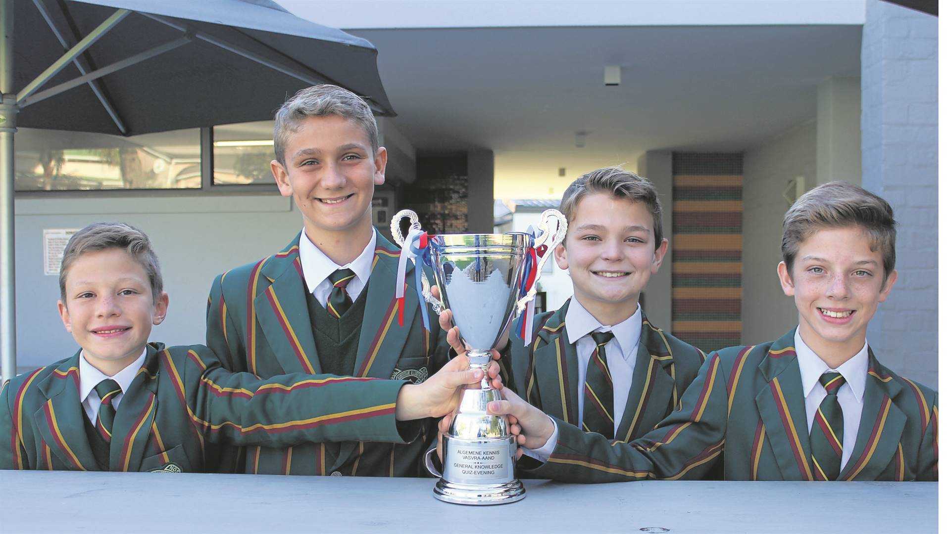 Laerskool Paarl Gimnasium se graad 6-span was die wenners by Laerskool Courtrai se jaarlikse algemenekennisvasvra. Van links is Phillip du Preez, Hanco Botha, Liam Vögel en Derrick van Antwerpen by hul beker as wenprys.