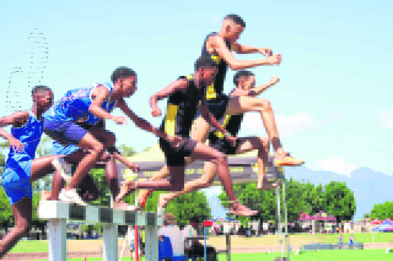 Atlete van Bolandse skole spring met gemak oor een van die hindernisse in die WP skole-atletiek-kampioenskap wat Saterdag by die Daljosafat-stadion plaasgevind het.Foto: Ernest Kilowan