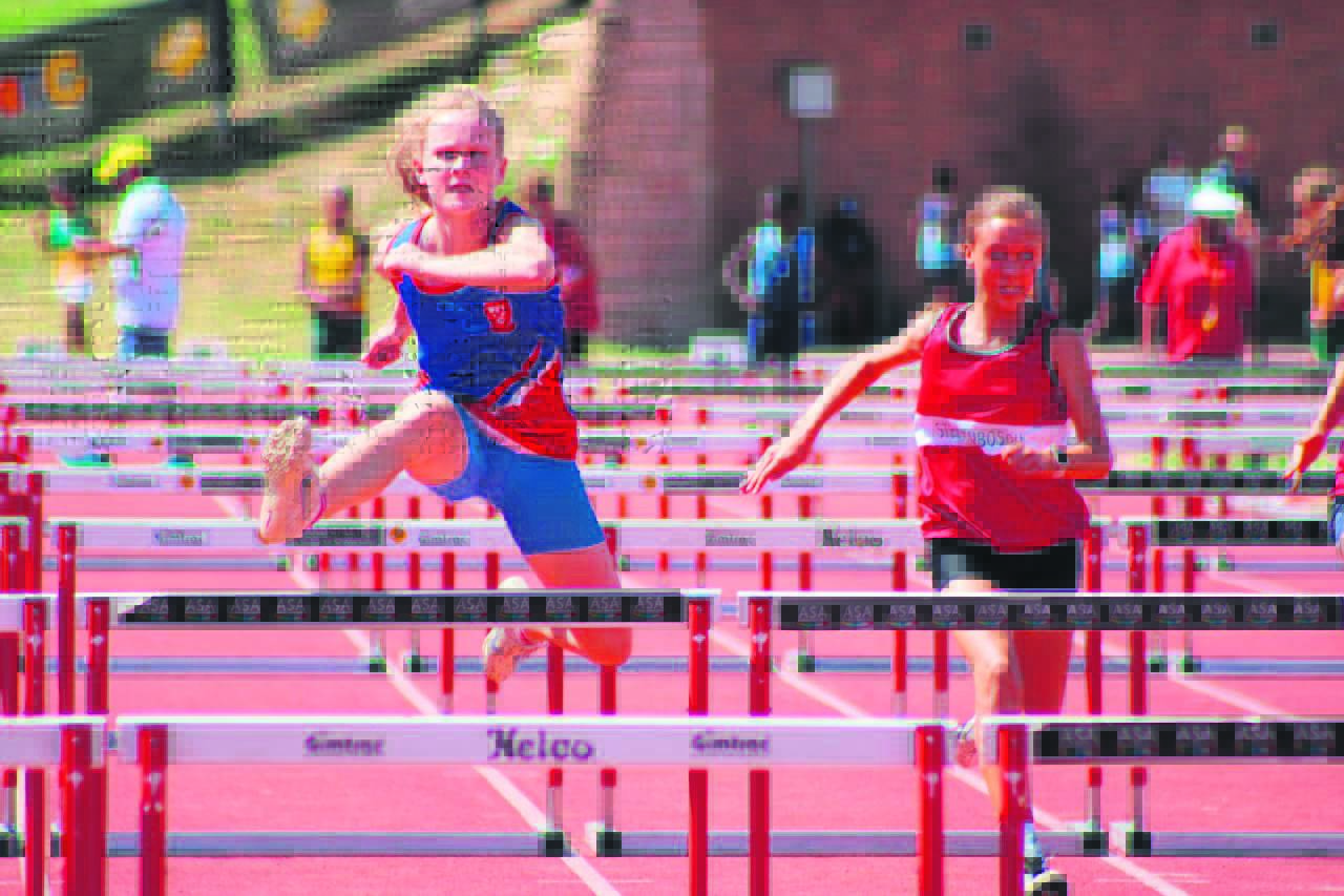 Die wafferse hekkiesatleet van Laerskool Courtrai, Zani Steyn, is hier oppad na die wenstreep van die o.13-hekkieswedloop.Foto: