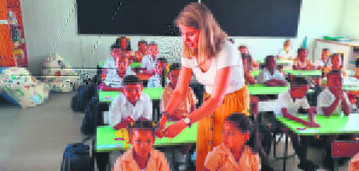 Die Laerskool Drakenstein se gr. 1-juffrou, Carina van As, maak klein Gia Plaatjies se vlegsel vas terwyl haar klasmaatjie Deu-Nieta Plaatjies toekyk. Die gr.1-klas was baie opgewonde oor hul eerste skooldag.Foto: Ross Michaels