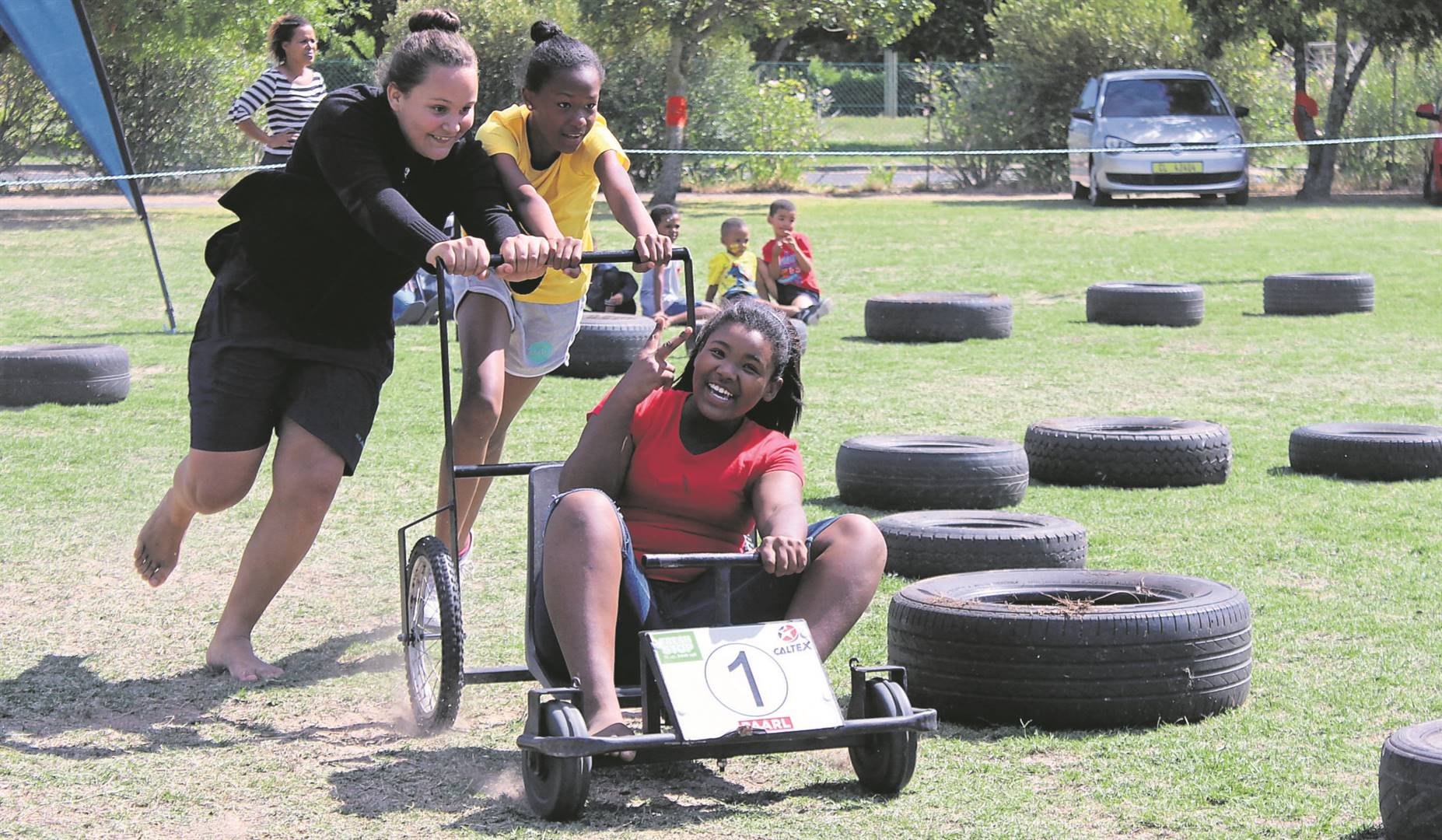 Laerskool WA Joubert het as deel van sy eeufeesvieringe sy jaarlikse kaskarresies gehou. Die dag het met ’n optog begin waarna elke klas teen mekaar meegeding het. Amy Job, Emily Kotzee en Kayla Lesch het die dag baie geniet. Foto: Devidean Moses