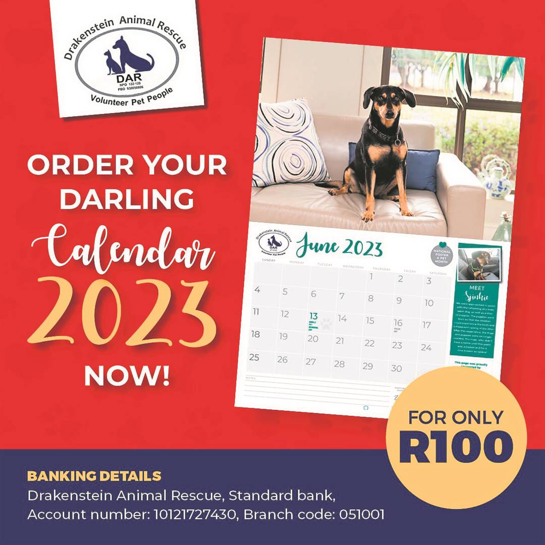 Drakenstein Animal Rescue (DAR) present their 2023 calendar for sale. Each month features a different pet. DAR is a pro-life animal volunteer rescue organisation. The calendars cost R100 each and all money will be in aid of DAR. For more details, call 082 579 3005.
