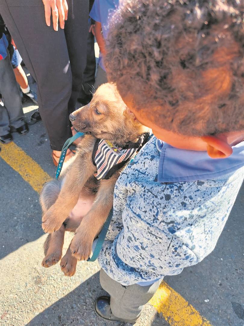 ’n Leerder van een van die skole wat die Khula Development Group en Paarl Rescue Obsessed besoek het, gee ’n bietjie liefde aan ’n hondjie.