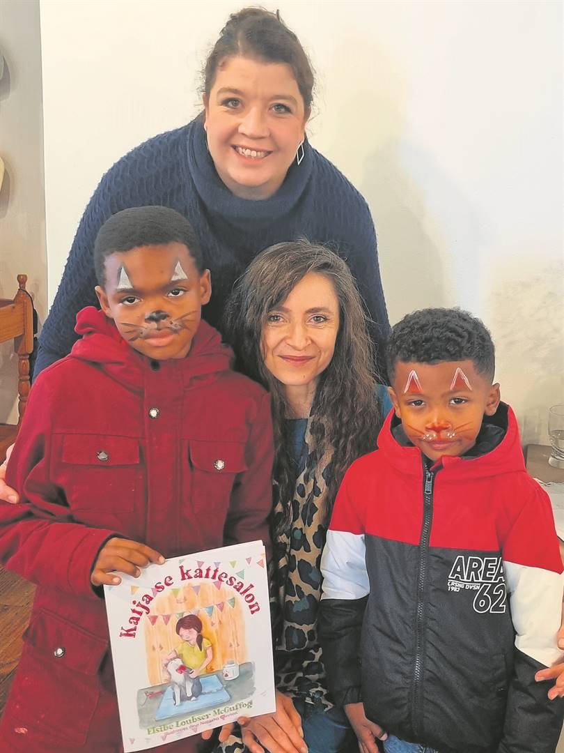 Die Wellingtonner Elsibe Loubser McGuffog (middel) se kinderboek, Katja se kattesalon, is met groot pret en plesier (en selfs ’n gemiaau!) in die Cloete Gemeenskapsgalery by die Breytenbachsentrum bekendgestel. Hier is McGuffog saam met Erna Smit, ’n leerkrag van Blouvlei Akademie, en twee van haar leerders, Julian Snyders (links) en Christopher van Wyk (regs).Foto: Engela Duvenage