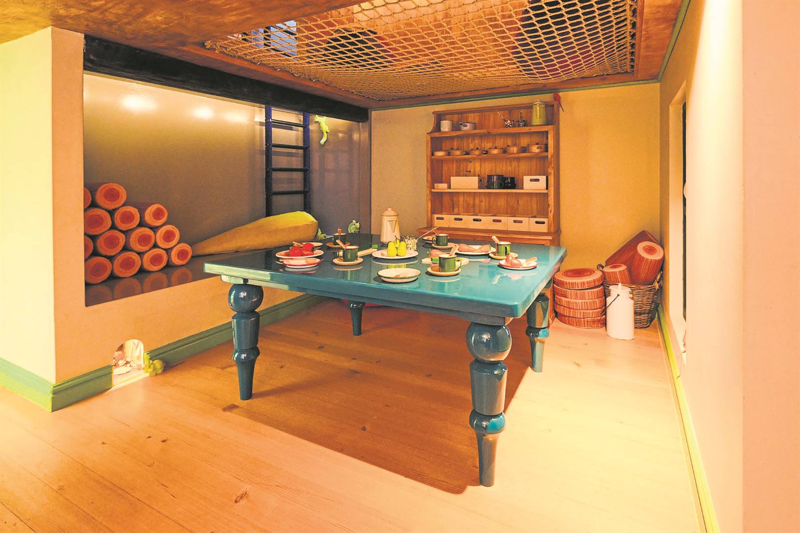 “Daar is ook ’n eetkamer wat deur Gabi Alberts in miniatuur voorgestel is as ’n kunswerkie bo die kaggel, en kinders word ook aangemoedig om deur die kaggel te kruip tot in die slaapkamer, waar die bed ’n trampolien is. Wie wil nou nie op ’n bed spring nie!”