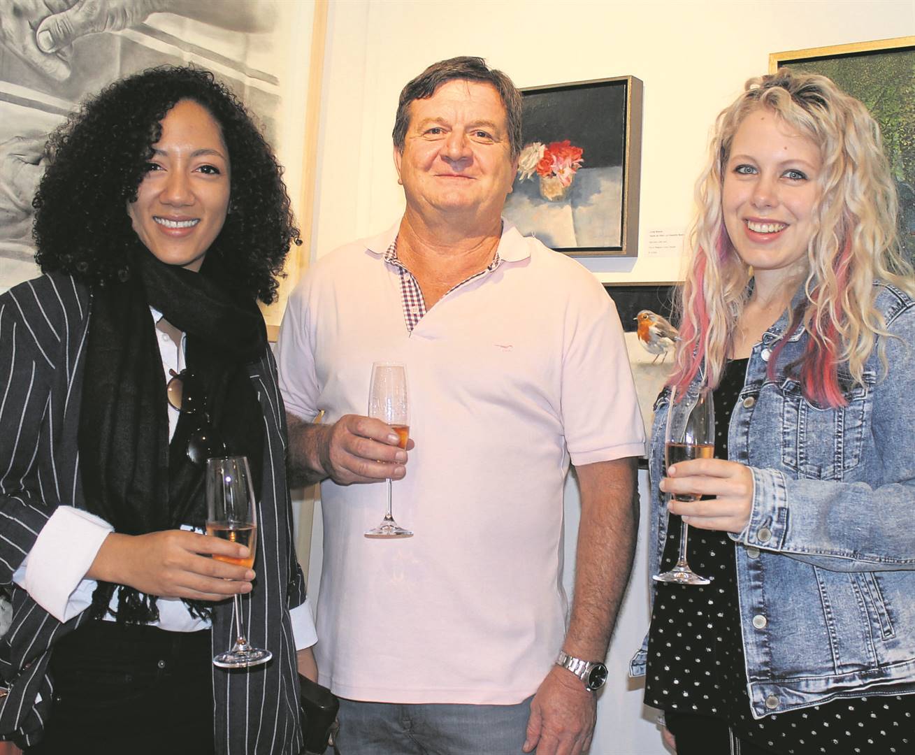 As deel van die L’acte final- kunsuitstalling wat onlangs in die Breytenbach-sentrum plaasgevind het, is kunstenaars soos Robyn Pretorius (links) en Hestemari Ferreira se werk uitgestal. Jan Koster (direksielid van Breytenbach-sentrum) het die kunsuitstalling saam met hulle geniet.Foto: Devidean Moses
