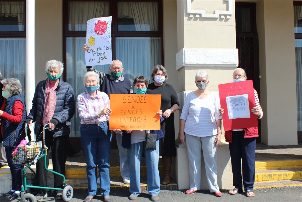 Só lui die plakkaat van een van die sowat 30 Huis Vergenoegd-inwoners wat vanoggend (17 September) ‘n vreedsame demonstrasie buite die ouetehuis gehou het.