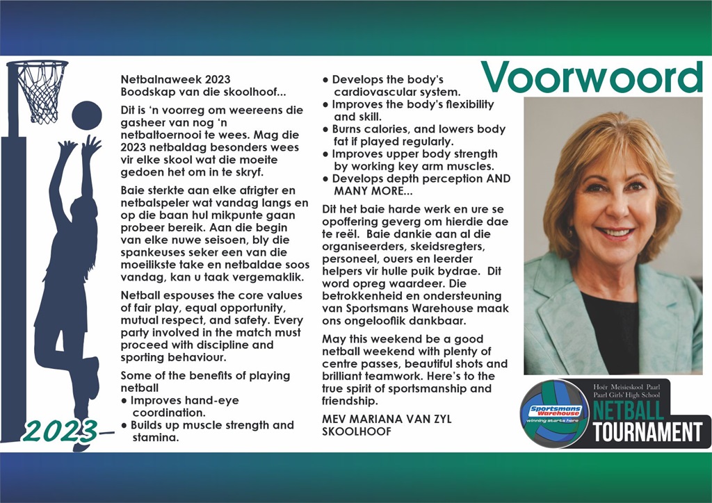 Hoër Meisieskool Paarl bied ‘n o.14 – o.18 netbaltoernooi aan dié naweek van 17 tot 21 Maart. Twintig skole ding mee sodat die gees van sportmangees kan seëvier. Elke liewe deelnemer is reeds ’n wenner en word ook genooi om na die tyd ons pragtige dorp, Paarl, te verken en ons uitmuntende restaurante en natuurskoon te geniet.