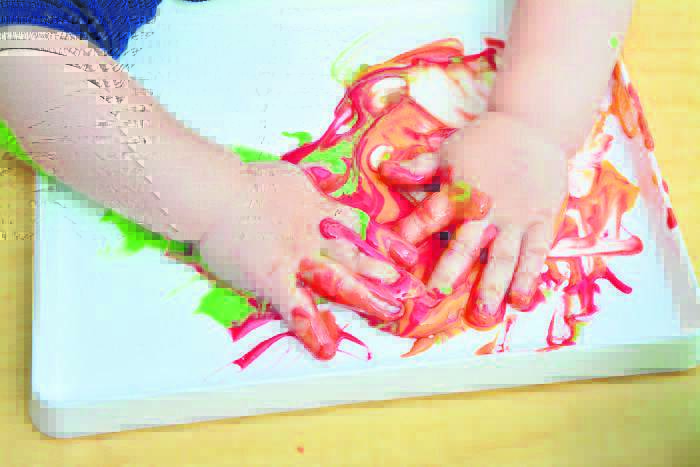 Koop ongegeurde joghurt en verdeel dit tussen ’n paar houers waarin die kind sy of haar hande kan druk. Voeg dan verskillende kleure voedselkleursel by.