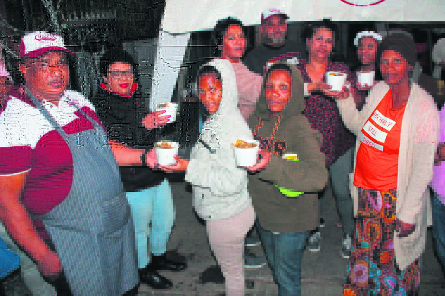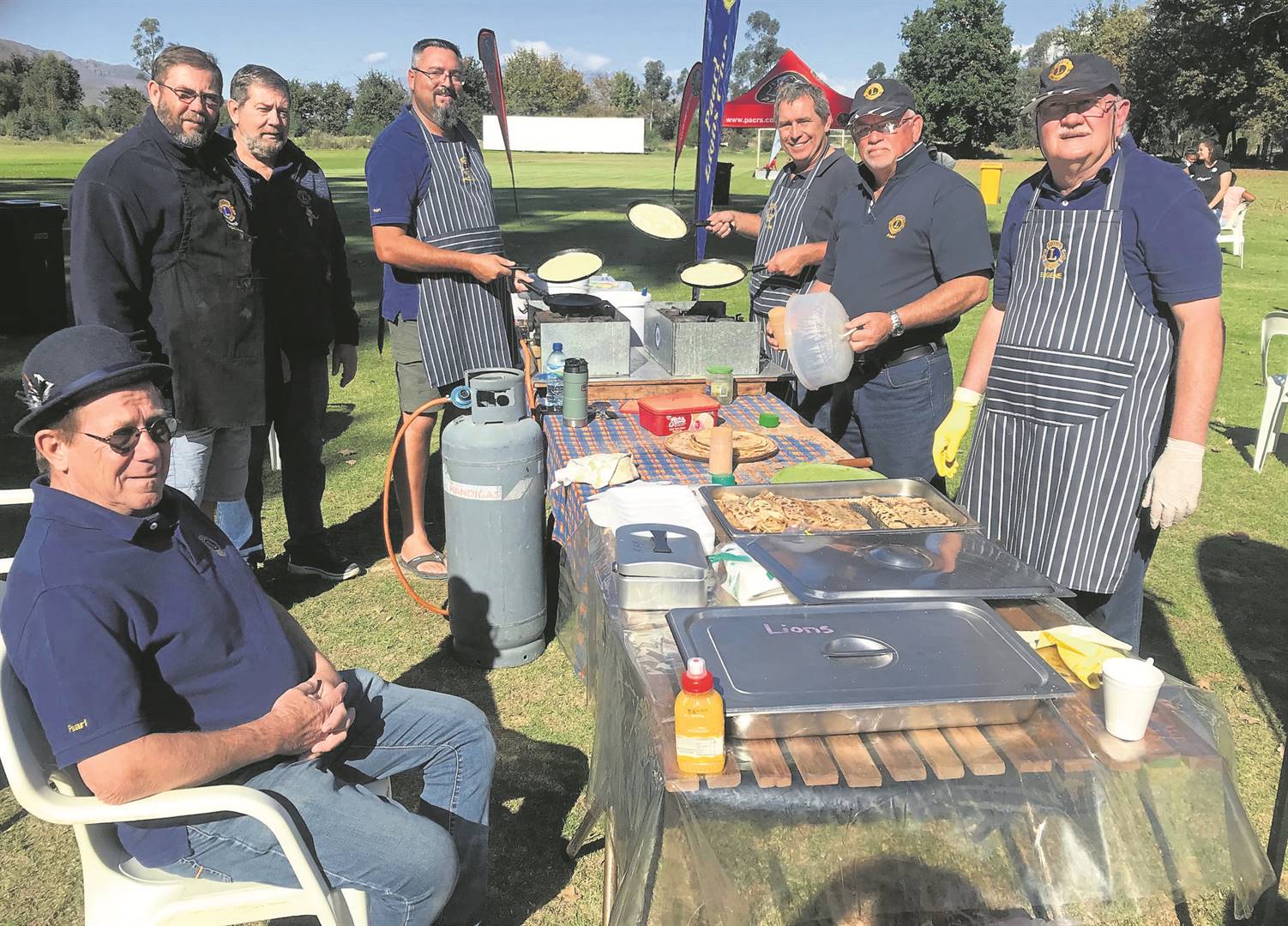 Die manne van Paarl Lions het Saterdag heerlike pannekoek en hamburgers by vanjaar se Hospies-herdenkingslopie, wat by die Paarl Arboretum gehou is, opgedis. Van links is Oubaas Schabort, Johann Smith (gebiedsvoorsitter), David Manthey, Jacques Calitz (dienste-voorsitter), Willem Esterhuizen, Boeta Munnik en Eugene Lamprecht. Foto: